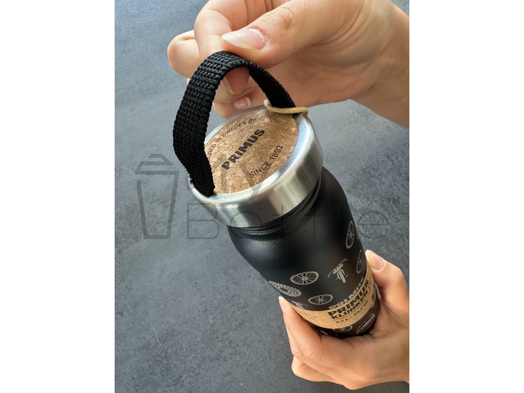 Láhev má široké šroubovací víčko. Díky tomu se z ní nejen snadno pije, ale rovněž se jednoduše naplňuje a čistí. Víčko má korkovou povrchovou úpravu a praktické, barevně sladěné poutko k uchycení.