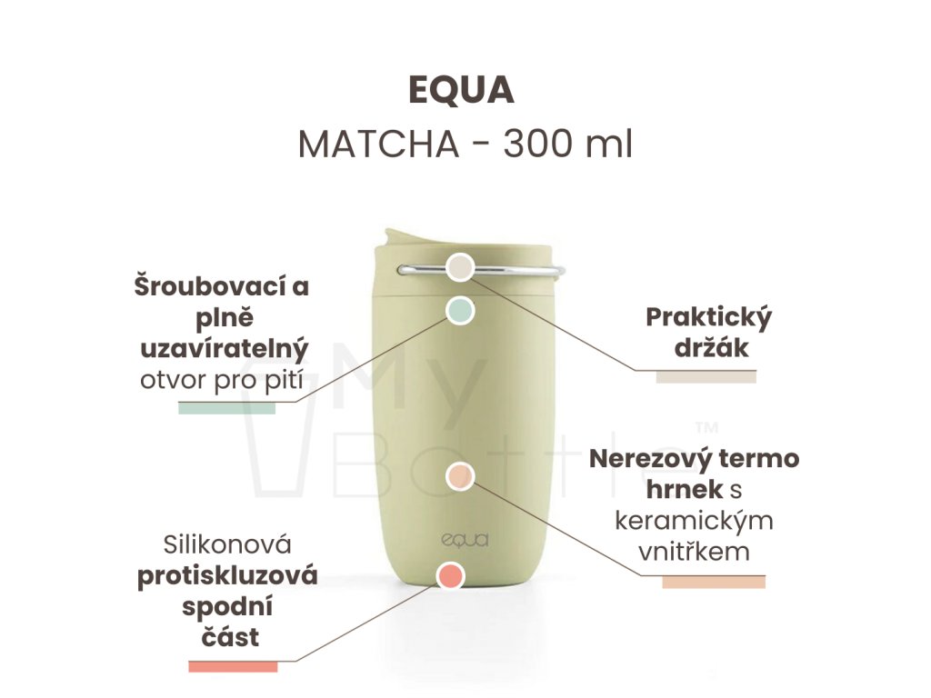 Equa termohrnek jsme si zamilovali hned od začátku. Největší výhodou je zejména šroubovací víčko a uzavíratelný otvor pro pití, který je pevný a velmi pěkně drží. Jelikož máme malé dítě, tak se nám už párkrát stalo, že termohrnek hodil do tašky (a přestože doporučujeme nosit hrnek vždy zpříma) a díky tomuto systému víčka, obsah nevytekl. Další perfektní vychytávkou, kterou jsem si myslela, že vůbec nevyužiji je praktický držák – když máte opravdu plné ruce, díky tomu, že je dostatečně velký si ho umíte doslova jen „zavěsit“ na ruce/prst a nijak vám to nezabere „volnou ruku“.